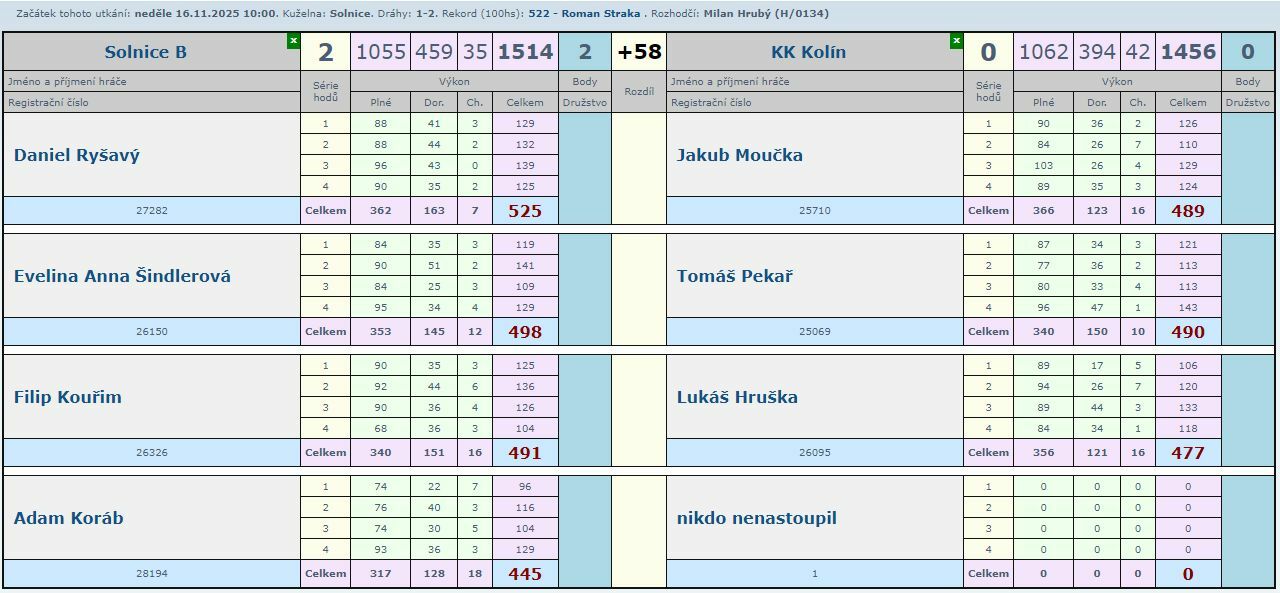 Do Solnice jsme odjížděli v naší nejsilnější možné sestavě se všemi kluky a mlhavou vidinou a touhou po prvním (případném) vítezství v souteži. B družstvo domácích je přeci jenom o něco slabší, než jejich A tým, se kterým jsme už v Solnici hráli a místní dvoudráhu si tak vyzkoušeli. Naši kluci ale v Solnici opět nepřekročili svůj stín a žádnému z nich se nepodařilo překročit hranici 500 poražených kuželek. Po namlsání se skvělými výkony v Poděbradech při SP mládeže, to byl návrat do starých kolejí. :-) Všichni tři se svými soupeři prohráli a jen slabou náplastí se skutečnost, že čtvrtého hráče domácích by naopak všichni porazili. Do výkonu družstva se počítají výkony tří nejlepších hráčů a v tom jsem tentokrát opět tahali za kratší kus provázku. Výsledky: J.Moučka 489 (-36), T.Pekař 490 (-8), L.Hruška 477 (-14).