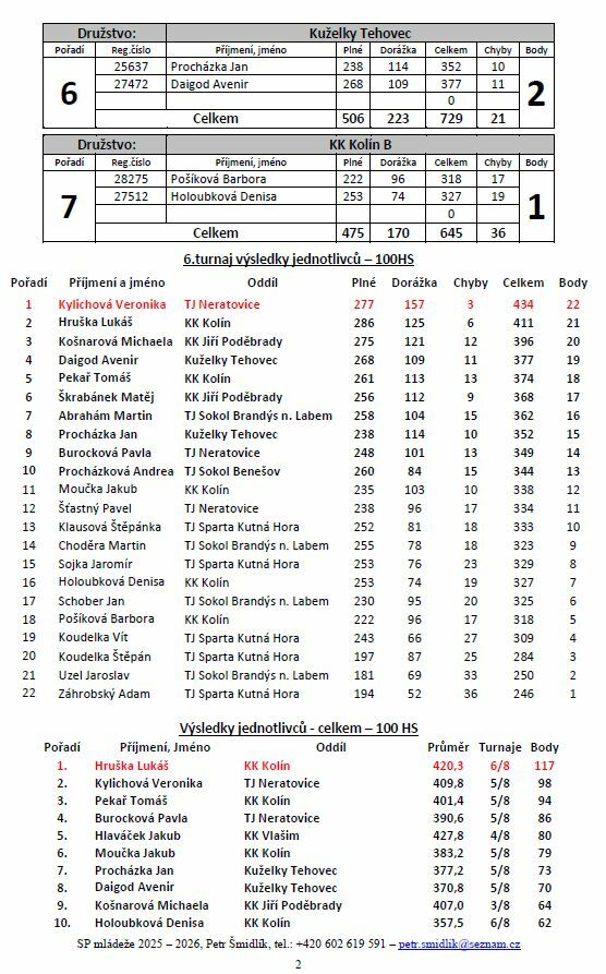 Na neoblíbenou a nepadavou dvoudráhovou kuželnu do Brandýsa n.L. jsme, na 6. turnaj SP mládeže, nejeli úplně s radostí, ale při vědomí dostatečného náskoku v soutěži družstev jsme byli celkem v klidu. Byla tedy jen otázka, jak se zadaří našim hráčům v soutěži jednotlivců a jestli udrží své pozice i v této soutěži. Byli jsme v "plné síle" tří kluků a dvou děvčat a s dopravou nám vypomohla maminka Dendy Holoubkové (díky Oli). V první dvojici hráli Kuba Moučka s Tomášem Pekařem. Kuba prakticky netrénuje a hraje také sporadicky, ale s výkonem 338 nemohl být spokojený NIKDO. Hlavně výkon do "plných" (235) byl hodně špatný a nebyl hoden tak zkušeného hráče. Tomáš Pekař zahrál, na místní poměry, slušných 374, což mu v tomto 6. turnaji stačilo na 5. místo. Při těchto dvou výkonech jsem se ale začal trochu obávat o celkové umístění v turnaji, protože třetí člen našeho "A" družstva, Lukáš Hruška taky tuto kuželnu moc nemusí.